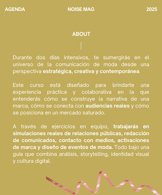 Desde 2018, Noise se ha convertido en un puente entre creativos y la industria de la moda, democratizando el acceso a la educación de moda con programas únicos que buscan sacar lo mejor de ti. Más que una plataforma educativa, Noise es un medio que impulsa a talentos emergentes, dándoles las herramientas y conocimientos para destacar en el mundo de la moda. Hoy, Noise ha tenido el privilegio de formar a más de 2,800 creativxs en más de 7 países, ofreciendo educación de calidad y una red de contactos valiosa. Únete a Noise y sé parte de una comunidad global que está revolucionando la moda desde adentro.